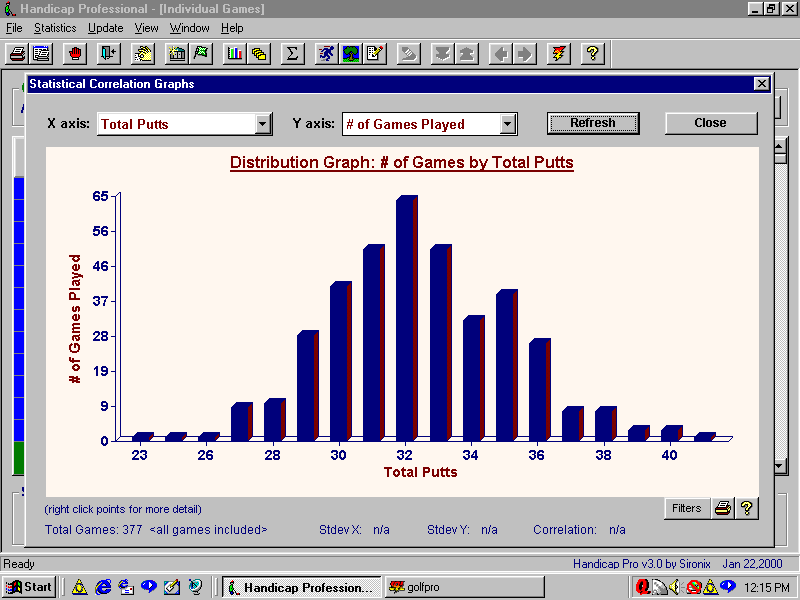 typical value is an indication of your consistency. In the example below, total number of putts per round is graphed. Out of the total number of rounds played, you can see how many times this golfer took 31 putts, 32 putts, 33 putts etc. |