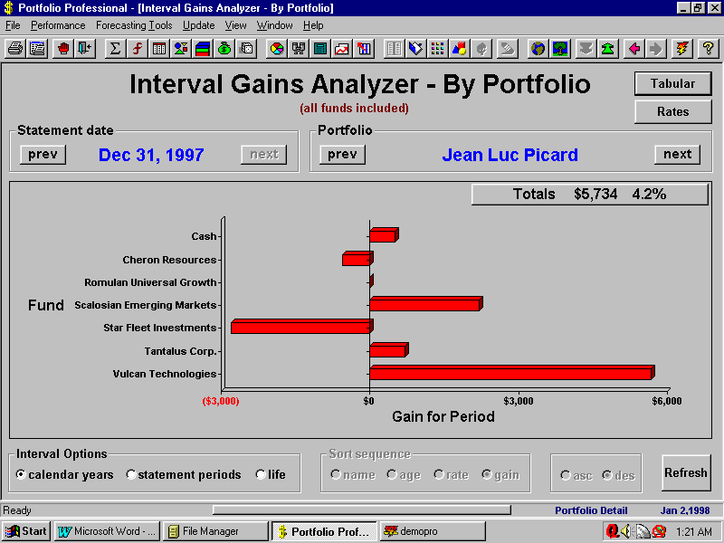 | This screen summarizes gains for an individual portfolio for any calendar year. Each investment held during the year is represented with a bar in the graph. You can quickly see where money was gained or lost. The rates option allows you to switch to a comparison of rates rather than dollar gains.